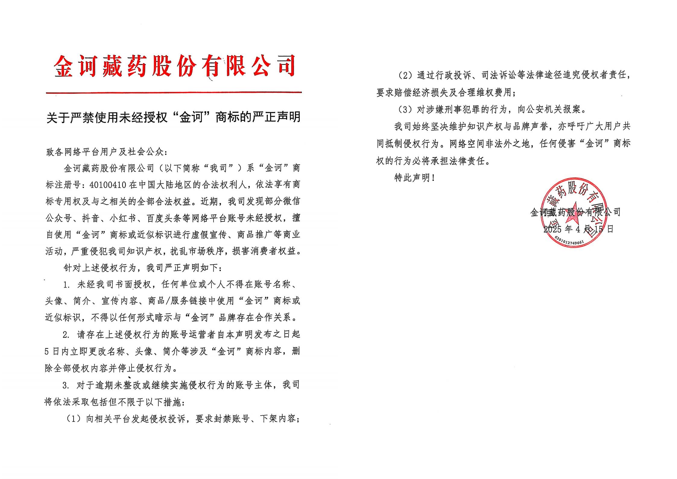 關(guān)于嚴(yán)禁使用未經(jīng)授權(quán)“金訶”商標(biāo)的嚴(yán)正聲明